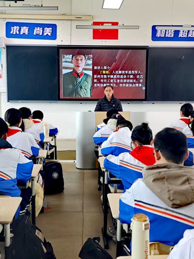 丁老深情講述了戰(zhàn)友們在極端艱難的條件下,解放軍援越抗美部隊?wèi)?zhàn)友們克服重重困難,圓滿完成公路修筑任務(wù)的感人事跡。他緬懷了在戰(zhàn)爭中英勇獻身的烈士們,他們用鮮血和生命詮釋了人民解放軍的堅強意志和崇高的愛國主義精神。一個個感人至深的英雄故事,一幅幅驚心動魄的戰(zhàn)斗畫面,讓在場的每一位同學(xué)深受觸動,熱淚盈眶。