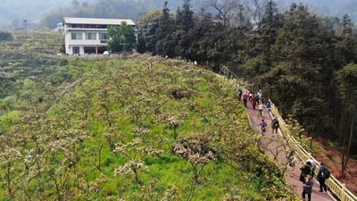 春日遲遲,卉木萋萋,蜀南長(zhǎng)寧,佛來靈山,春雷初醒,千峰競(jìng)秀。當(dāng)是時(shí),梨云漫卷,雪浪翻涌,萬(wàn)畝瓊林,香浸天地。游者紛至,或踏青尋芳,或訪古探幽,共赴一場(chǎng)梨花勝會(huì)。佛來之梨,非尋常可比。其樹或參天蔽日,或虬枝盤曲,或新芽如星,或老干生苔。晨霧未散,梨花似籠輕紗,若隱若現(xiàn);日影初臨,玉瓣凝露,瑩瑩如琢。及至晌午,金光漫灑,花影斑駁,恍若瑤池仙子遺落銀簪,碎玉點(diǎn)點(diǎn),綴滿青巒。暮色四合,晚風(fēng)徐來,暗香浮動(dòng),更添“月下梨花”之清絕。時(shí)有蜂蝶穿花,山雀啁啾,幽谷生韻,靈山自鳴。