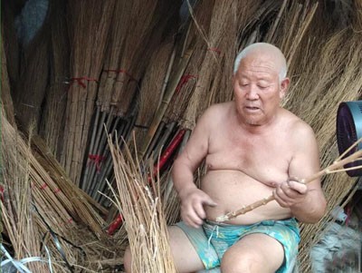 又忙著手里編掃把的活兒