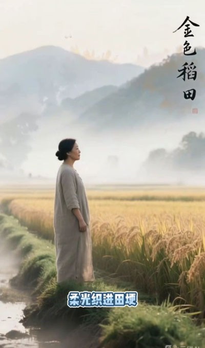 清晨,薄霧如輕紗般悄然鋪展,溫柔地掀開(kāi)四川武勝農(nóng)門(mén)那靜謐的面紗。稻田在熹微的晨光中低垂著穗頭,一串串金黃的稻谷仿佛在竊竊私語(yǔ),訴說(shuō)著大地深處最細(xì)膩、最溫情的秘密。露珠沿著修長(zhǎng)的葉尖緩緩滑落,宛如一句尚未落筆的詩(shī)行,晶瑩剔透,含蓄婉約,帶著幾分少女般的羞怯與詩(shī)意。這一刻,秋天并非以喧囂的姿態(tài)降臨,而是將陽(yáng)光細(xì)細(xì)捻成柔光的絲線,一針一線,悄然織進(jìn)軍綠色田埂的褶皺里,也織進(jìn)了女人心底那份對(duì)故土綿長(zhǎng)而深沉的眷戀。