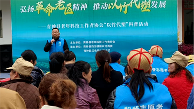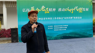 青神縣老促會副會長蔣海清,代表青神縣革命老區(qū)建設(shè)促進會,對老科協(xié)成功舉辦“弘揚革命老區(qū)精神,推動以竹代塑發(fā)展”是科普活動,表示祝賀。他說:“以竹代塑”是縣委、縣政府實施的重要工程。希望“以竹代塑”理念深入人心,成為助力鄉(xiāng)村振興的一個重要支撐。