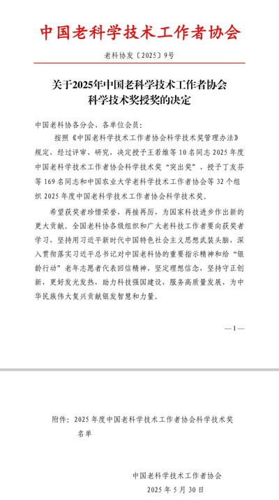 日前,中國(guó)老科協(xié)發(fā)出授獎(jiǎng)決定,授予10 名同志 2025 年度中國(guó)老科學(xué)技術(shù)工作者協(xié)會(huì)科學(xué)技術(shù)獎(jiǎng)“突出獎(jiǎng)”、169 名同志和32個(gè)組織2025 年度中國(guó)老科學(xué)技術(shù)工作者協(xié)會(huì)科學(xué)技術(shù)獎(jiǎng)。合江縣老科協(xié)會(huì)長(zhǎng)張發(fā)遠(yuǎn)榜上有名,位居科學(xué)技術(shù)獎(jiǎng)之列。
