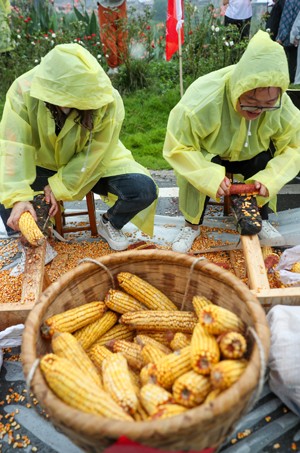 2023年9月22日,四川省廣安市各區(qū)市縣的選手在華鎣市祿市鎮(zhèn)涼水井村參加趣味活動“玉米脫粒”比賽,在開心中慶祝中國農(nóng)民豐收節(jié)。(邱海鷹)