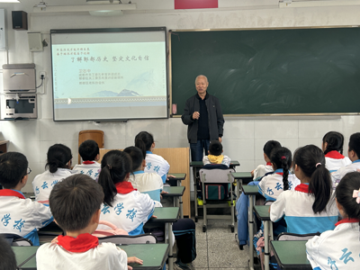 老科協(xié)會長衛(wèi)志中老師則以《了解郫都?xì)v史,堅定文化自信》為主題,講述郫都以及學(xué)校所在地友愛鎮(zhèn)的悠久歷史和燦爛文化,讓孩子們在輕松愉快的氛圍中感受到了中華文化的博大精深,衛(wèi)老師從友愛鎮(zhèn)、子云學(xué)校的得名講起,再講區(qū)名,從“郫”“都”兩個字的偏旁入手,探尋字源,讓學(xué)生領(lǐng)略到了“郫都”字的深厚底蘊。