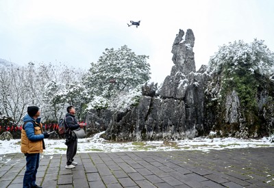 2025年1月10日,在白雪覆蓋的四川省廣安市華鎣山,市民在用無(wú)人機(jī)拍攝一對(duì)形似情侶名為“千年一吻”(或“一吻千年”) 的巖石。(邱海鷹 劉南賢)