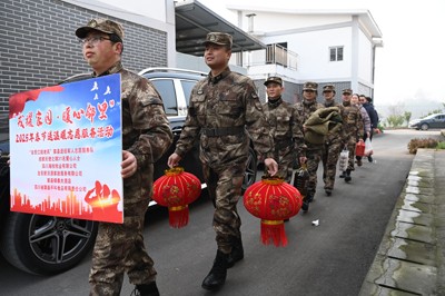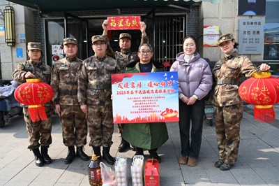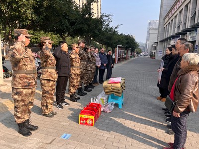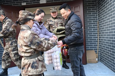 在雙石鎮(zhèn)大竹林村現(xiàn)役軍人黃揚(yáng)州家,志愿服務(wù)隊(duì)隊(duì)員們又是送年貨、又是掛燈籠、又是貼春聯(lián),樂(lè)得黃揚(yáng)州的父親及爺爺一個(gè)勁的點(diǎn)贊說(shuō):“多謝你們了,多謝你們了,我一定把這個(gè)喜事告訴兒子,叫他在部隊(duì)刻苦鍛煉,為家鄉(xiāng)爭(zhēng)光!”