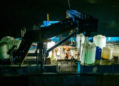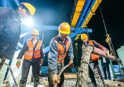 圖為2025年1月18日晚,中鐵十局的建設(shè)者挑燈夜戰(zhàn)在西渝高鐵四川省華鎣市清溪口特大橋跨滬蓉高速公路128米連續(xù)梁中跨合龍現(xiàn)場(chǎng)緊張作業(yè)。(邱海鷹)