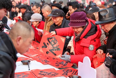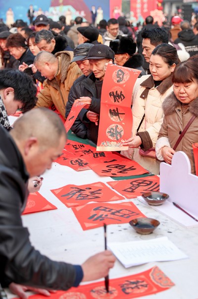 2025年1月20日,四川省華鎣市市民在華鎣山廣場領(lǐng)取書法志愿者義務(wù)為他們書寫的“福”字門貼和春聯(lián)。