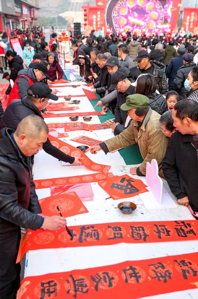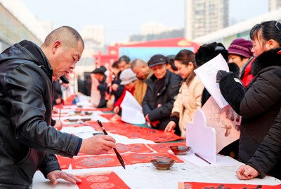 2025年1月20日,四川省華鎣市的書法志愿者在華鎣山廣場義務(wù)為市民書寫春聯(lián)和“福”字門貼。(邱海鷹)