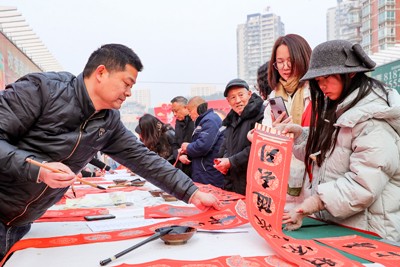 2025年1月20日,四川省華鎣市書法家協(xié)會的志愿者來到人流量較大的華鎣山廣場,為市民義務(wù)書寫春聯(lián)和“福”字等門貼,祝福市民過上一個快樂祥和的新春佳節(jié)。