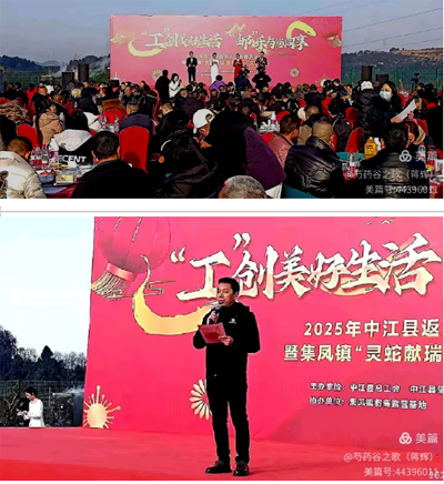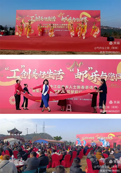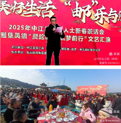 玉龍歡歌辭舊歲,金蛇狂舞迎新春。在中華民族傳統(tǒng)的 春節(jié)即將到來之際,由中江縣總工會中江縣集鳳鎮(zhèn)黨委、政府、中江縣郵政分公司主辦,中江縣集鳳鎮(zhèn)芍藥谷路營基地協(xié)辦的“工”創(chuàng)美好生活 “郵”樂與您同享——2025年中江縣返鄉(xiāng)人士新春茶話會暨集鳳鎮(zhèn)“靈蛇獻(xiàn)瑞 筑夢前行”文藝匯演在中江縣芍藥谷露營基地隆重舉行。