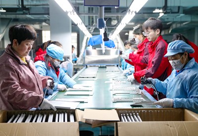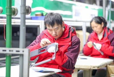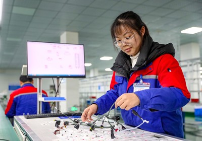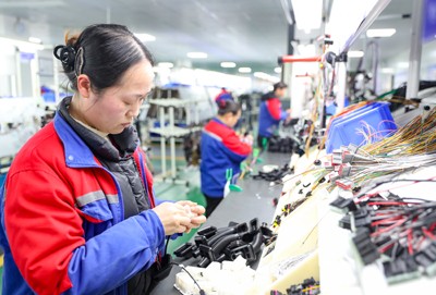 2025年2月5日,四川省廣安華鎣市的返鄉(xiāng)民工在家門(mén)口的華鎣山經(jīng)開(kāi)區(qū)大千電子科技有限公司車(chē)間緊張作業(yè)。