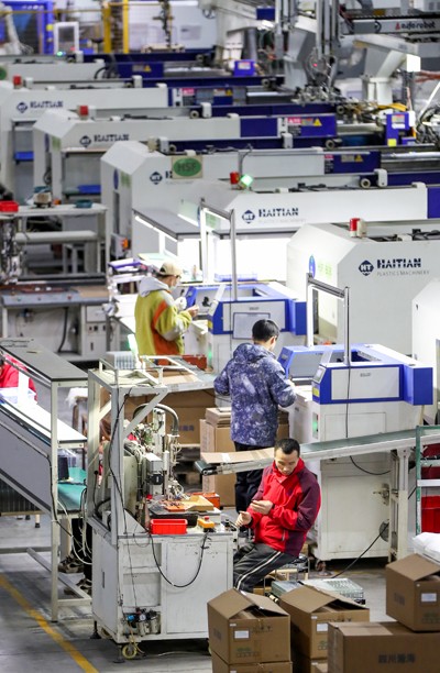 2025年2月5日,四川省廣安華鎣市的返鄉(xiāng)民工在家門(mén)口的華鎣山經(jīng)開(kāi)區(qū)瀚海精密制造有限公司車(chē)間緊張作業(yè)。(邱海鷹)