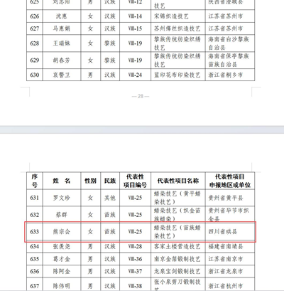 2025年3月17日,文化和旅游部公布了第六批國家級非物質(zhì)文化遺產(chǎn)代表性傳承人名單,宜賓市珙縣苗族蠟染技藝大師熊宗會(苗)名列其中。