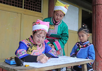 學會苗族蠟染技藝的熊宗會大師,幾十年如一日地學習鉆研、辛勤傳承,先后被授予四川省農(nóng)村手工藝大師(2018年12月)、川渝鄉(xiāng)村女能人之“巧手鄉(xiāng)村女工匠”(2021年9月)、四川省非物質(zhì)文化遺產(chǎn)優(yōu)秀傳承人(2019年12月)。其作品《苗族蠟染系列》被評為“看四川—民間文藝創(chuàng)作工程優(yōu)秀作品”,《掛畫》獲得“中國白酒文化節(jié)民間工藝品展”金獎。