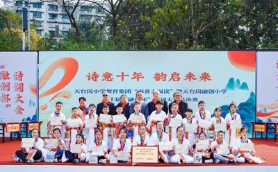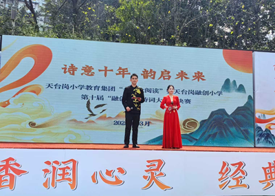 校長徐勇在致辭中介紹,“融創(chuàng)杯”詩詞大會已成功舉辦十屆,彰顯了天臺崗融創(chuàng)小學“融匯傳統(tǒng)、創(chuàng)新未來”的辦學思路,明確了“國學、國術、國藝”為載體,突出了傳統(tǒng)文化辦學特色,讓每一個孩子在中國傳統(tǒng)文化的浸潤下幸福成長,實現(xiàn)學校“扎基石、顯特色、創(chuàng)品牌”的發(fā)展總目標。大會以“詩意十年,韻啟未來”為主題,希望與會嘉賓與師生們歡聚一堂,共享中華傳統(tǒng)詩詞之美。