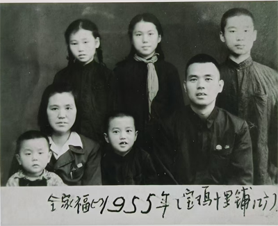 榮鴻琪(時(shí)8歲)1955年的‘全家福“合影,照片下側(cè)為榮泉源回憶歷史之手跡(其90歲 ——2000年寫)。