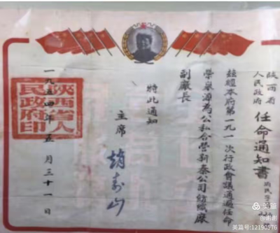 榮泉源任職的《陜西省人民政府任命通知書》