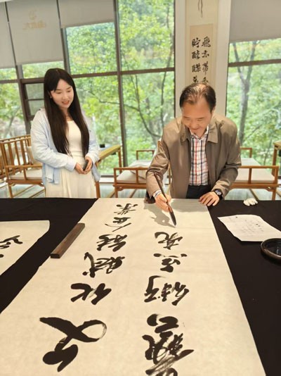 掛牌儀式結(jié)束后,南充、營山的書法家們即興揮毫、筆走龍蛇,為大地魂酒業(yè)有限公司留下了一幅幅精美書法。彭繼榮書寫的《文化賦能企業(yè)、藝術(shù)點(diǎn)亮鄉(xiāng)村》,直奔主題,令人贊嘆。鄧鵬雙手捧著著名書法家劉澤笑為自己茶園寫的兩幅對聯(lián):“水可潤心茶明德、詩能言志畫寄情”,“翠葉凝香迎遠(yuǎn)客、清泉煮韻待知音”,臉上露出了欣喜的笑容,遂了自己久日的心愿。