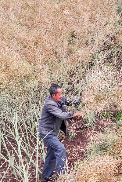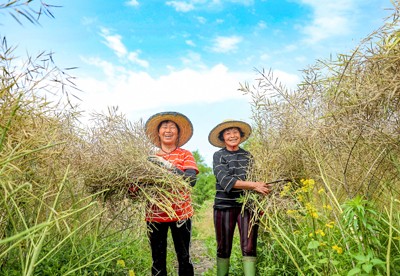 2025年5月9日,四川省華鎣市永興鎮(zhèn)大佛山村的村民奔忙田間,收割在以工代賑項(xiàng)目基地種植的優(yōu)質(zhì)油菜。