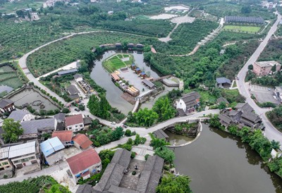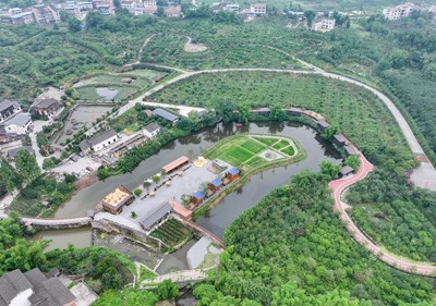 圖為2025年6月4日,鳥瞰四川省華鎣市祿市鎮(zhèn)涼水井村依托楊家河半島打造的集特色餐飲、休閑娛樂、農事體驗等功能于一體的村集體經濟實體“月伴灣”生態(tài)農莊。(邱海鷹)