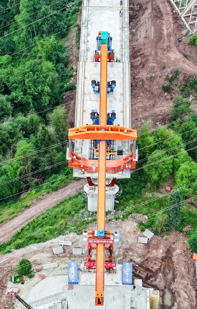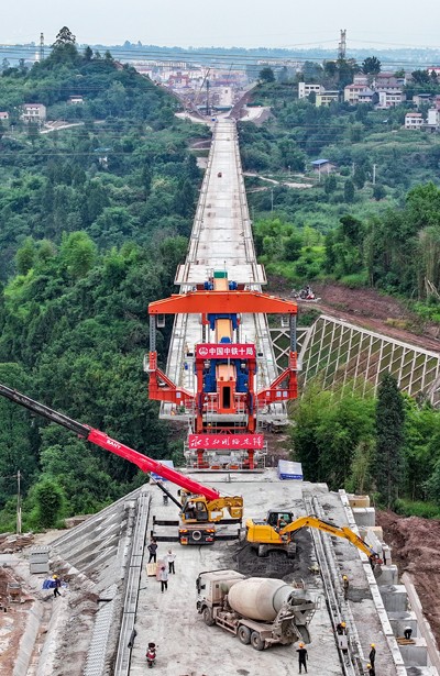 2025年6月5日,在四川省廣安華鎣市明月鎮(zhèn)拍攝的由中鐵十局承建的西渝高鐵何家灣特大橋梁架設(shè)施工現(xiàn)場。(邱海鷹 劉 忠/文圖)