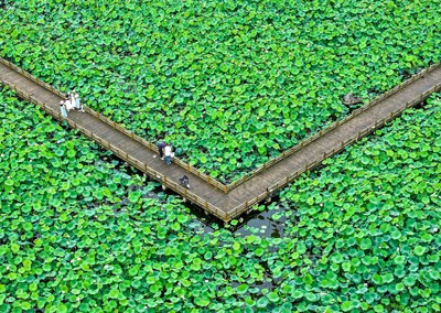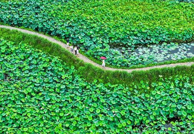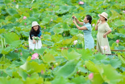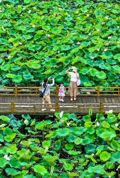 2025年6月25日,市民在四川省華鎣市明月鎮(zhèn)白鶴咀村利用渠江灘涂興建的“荷月江岸”生態(tài)荷塘打卡游玩。