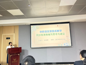 研討會(huì)第三個(gè)環(huán)節(jié)是《中職語文項(xiàng)目式教學(xué)同步檢測(cè)卷》主編鄭秀輝老師從概念界定、編寫目的意義、編寫原則、編寫方法四個(gè)大的方面匯報(bào)了檢測(cè)卷編寫思考與建議。