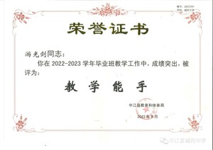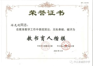所教學科的教學業(yè)績在縣上年年名列前茅、連續(xù)十余年被評為中江縣畢業(yè)班“優(yōu)秀學科教師”;多年來屢次獲得中江縣化學學科第一的好成績,2017年中考還獲德陽市化學學科第一的好成績。2021年被評為德陽市畢業(yè)班“先進教師”,2023年被評為中江縣“教書育人楷模”受到縣委縣府表彰,2023年九月被評為中江縣畢業(yè)班“教學能手”。