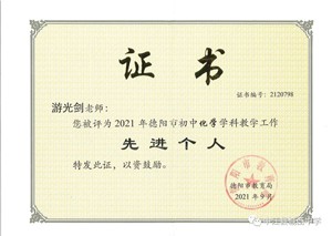 游光劍,中共黨員,高級教師。四川師范大學化學專業(yè)畢業(yè)。德陽市畢業(yè)班“優(yōu)秀教師”;中江縣“教書育人楷模”;中江縣畢業(yè)班“教學能手”;中江縣“優(yōu)秀教師”。