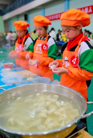 2023年11月2日,在四川省華鎣市雙河小學舉辦的“我是小能人,自理能力我最行”為主題的校園勞動節(jié)學生秀廚藝活動上,參加選手在包煮餃子。