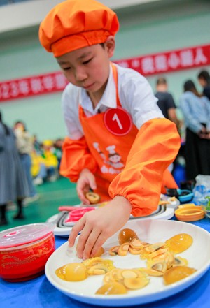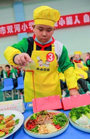 2023年11月2日,在四川省華鎣市雙河小學舉辦的“我是小能人,自理能力我最行”為主題的校園勞動節(jié)學生秀廚藝活動上,參加選手在制做涼菜。
