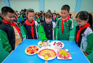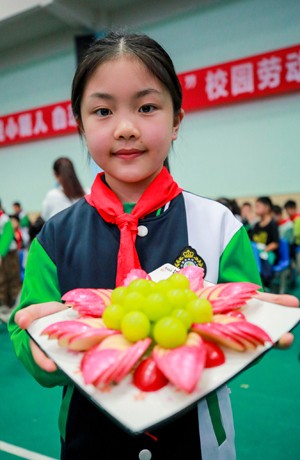 2023年11月2日,在四川省華鎣市雙河小學舉辦的“我是小能人,自理能力我最行”為主題的校園勞動節(jié)學生秀廚藝活動上,參加選手在展示自己制做的水果拼盤。