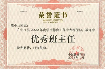 陳老師作為我們班的班主任,她是我們?nèi)嗤瑢W(xué)的領(lǐng)導(dǎo)者和教育者,更是我們健康成長的引路人。陳老師在我們身上傾注了無限的關(guān)懷與關(guān)愛,她認(rèn)真工作,從不敷衍,在班級管理方面卓有成效,她為我們量身定制了一套班規(guī)班紀(jì),由她賴以信任的班委干部督促著我們執(zhí)行,便有了我們班連續(xù)多次獲得了優(yōu)秀班集體的榮譽(yù)。