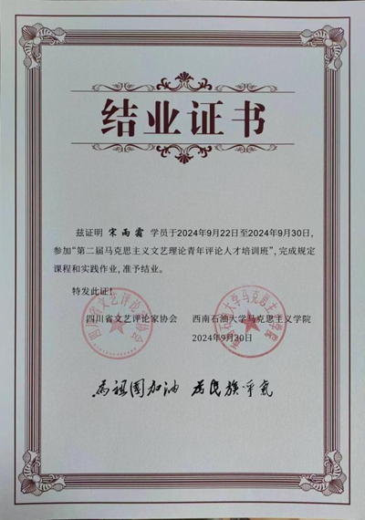 2024年9月22日至30日,由四川省文藝評論家協(xié)會、西南石油大學主辦,四川省馬克思主義文藝評論基地承辦的第二屆馬克思主義文藝理論青年評論人才培訓班在西南石油大學舉行培訓活動。成都文理學院青年教師、四川省文藝評論家協(xié)會會員宋雨霜經(jīng)過選拔,與另外29名學員一起參加了培訓活動,通過教學考核獲得結業(yè)證書。