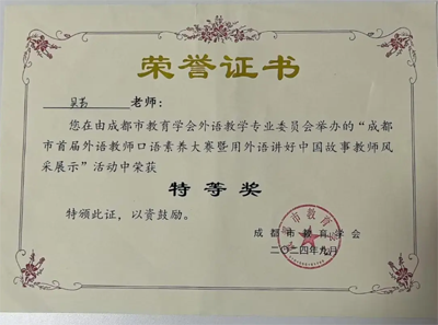 高中教師吳芳在雙流區(qū)課堂教學(xué)大賽中獲得二等獎(jiǎng),在成都市首屆外語(yǔ)素養(yǎng)口語(yǔ)大賽中榮獲特等獎(jiǎng)。