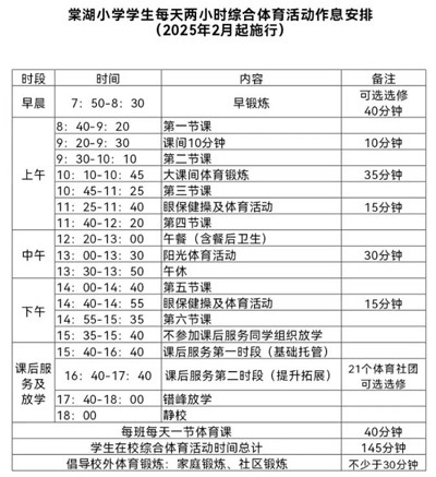 早鍛煉30分鐘,大課間35分鐘,午鍛煉30分鐘,課后服務(wù)第二時段60分鐘,上下午兩次眼操及課間活動30分鐘,每天一節(jié)體育課40分鐘,鼓勵校外鍛煉家庭鍛煉不少于30分鐘,確保學生每天有足夠的時間進行體育活動,讓體育鍛煉成為學生日常生活的一部分。