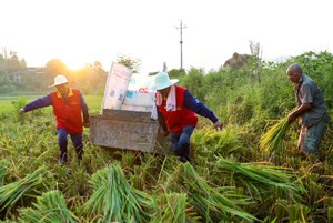 2023年8月10日, 國家電網四川省廣安華鎣市供電局組織的黨員志愿者身披朝陽, 在供區(qū)伏龍鎮(zhèn)青鳥石村幫助勞弱農戶裝運剛收獲的稻谷。