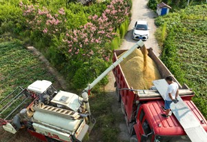 2023年8月15日,四川省廣安華鎣市華龍街道東方村的農(nóng)民在轉(zhuǎn)運收割機搶收的稻谷。