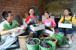 2023年7月12日,四川省廣安市社會保險局的黨員干部冒著酷熱,在華鎣市陽和鎮(zhèn)蔡家灣村幫農家包裝銷往市場的葡萄,體驗勞動的艱辛。