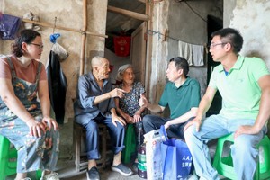 2023年7月12日,四川省廣安市社會保險局的黨員干部冒著酷熱,在華鎣市陽和鎮(zhèn)蔡家灣村看望慰問老黨員江顯發(fā)(左二)。