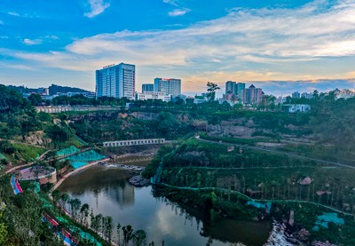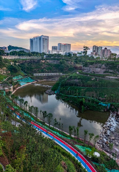 圖為2025年7月2日,四川省廣安市利用城區(qū)荒蕪的西溪峽谷打造的在夕陽(yáng)映照下的文旅新地標(biāo)西溪峽公園。(邱海鷹/攝影報(bào)道)