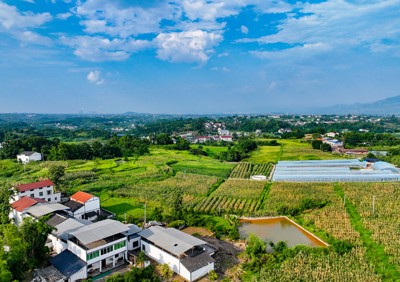 2025年7月21日,四川省華鎣市永興鎮(zhèn)馬架坪村連片泛著金黃的玉米、綠油油的水稻和用于種植養(yǎng)殖業(yè)的白色大棚及星羅棋布的民居,在藍(lán)天白云映襯下色彩斑斕,如披錦繡。