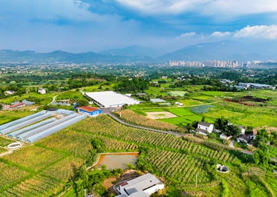 2025年7月21日,四川省華鎣市永興鎮(zhèn)馬架坪村連片用于種植養(yǎng)殖業(yè)的白色大棚和泛著金黃的玉米、綠油油的水稻及星羅棋布的民居,在藍(lán)天白云映襯下色彩斑斕,如披錦繡。(邱海鷹/攝影報(bào)道)