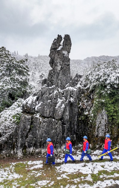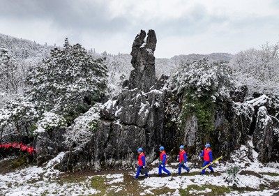 2025年1月10日,國家電網四川省華鎣市供電公司的共產黨員服務隊踏著積雪,奔忙在華鎣山區(qū)巡檢供電線路安全運行情況。