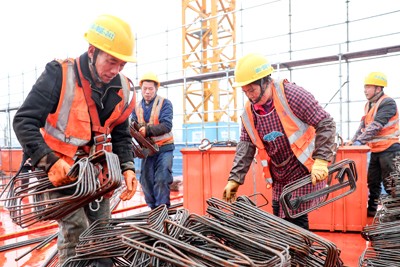 2025年2月2日(大年初五),在四川省廣安市廣安區(qū)官盛新區(qū)廣安理工學院建設工地,中建三局的建設者正冒著雨霧天氣轉運鋼筋。