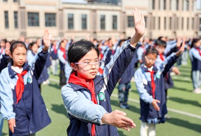 2025年3月27日,四川省華鎣市紅巖小學(xué)的學(xué)生利用大課間練習(xí)交通警察手勢信號廣播體操(簡稱“交通手勢操”),迎接第30個(gè)“全國中小學(xué)生安全教育日”。