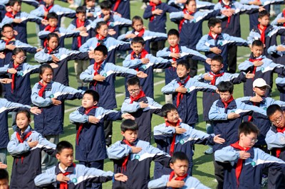 2025年3月27日,四川省華鎣市紅巖小學(xué)的學(xué)生利用大課間練習(xí)“交通手勢操”,迎接第30個(gè)“全國中小學(xué)生安全教育日”。