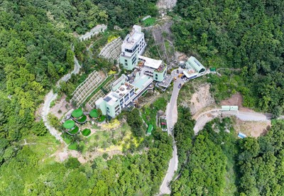 2025年8月21日,鳥瞰四川省華鎣市利用紅巖鄉(xiāng)高頂村廢棄的老龍洞煤礦改建的有熊貓?jiān)氐摹霸帷ず俚V熊貓”主題民宿。