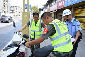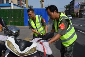 “過來一下‘兵哥哥’(退役軍人志愿服務(wù)隊隊員),把這三個亂放的摩托車抬到規(guī)范的停車位置上去。”在交警的指揮下,隊員范長青等二人協(xié)助交警把三輛摩托車從5米外地方抬到了停車位,汗水不斷從他們的身上冒出來。